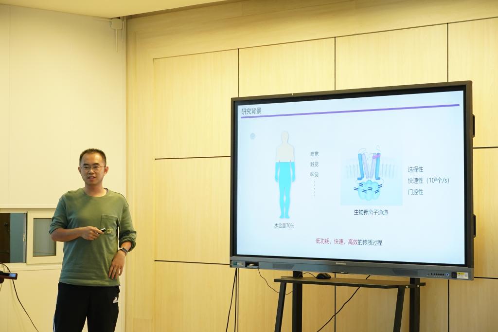勞俊超匯報了基于MXene的離子控制傳輸研究,基于液相剝離的Ti3C2二維納米片材料,通過自組裝方法構建亞納米尺寸的通道,研究強限域條件下的離子傳輸特性,達到接近生物離子通道性能的目的,為進一步與生物離子通道互聯提供研究基礎。
