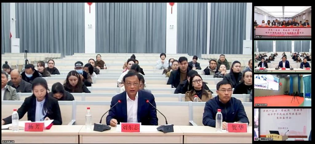 為引導思政教師將鑄牢中華民族共同體意識融入教學過程,11月7日,學校與新疆和田地區民豐縣教科局通過云端連線的方式,共同舉辦“津民一家親·思政課‘手拉手’—— 鑄牢中華民族共同體意識集體備課會”。校黨委書記劉東志,市社會主義學院教研部主任、教授吳星辰,西青區委統戰部副部長邰菲,天津援疆前指人才部副部長、和田地區教育局副局長賀華,民豐縣教科局黨組書記楊芳出席,兩地師生代表參加活動。校黨委副書記許瑞主持活動。