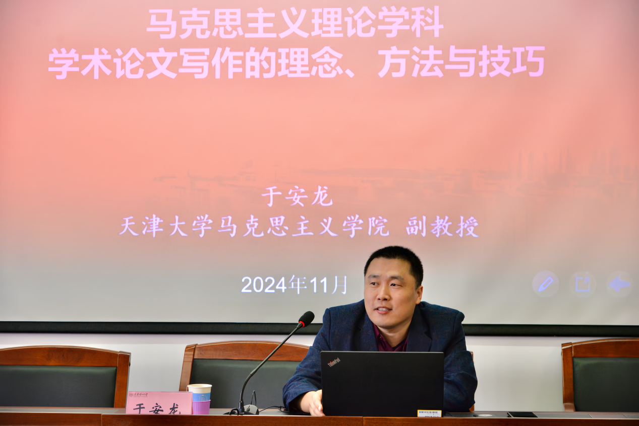 天津大學馬克思主義學院副教授于安龍作題為“馬克思主義理論學科學術論文寫作中的理念、方法與技巧”的專題報告會。于安龍將寫作理念概括為“頂天立地”“入流特立”和“知行合一”等內容,并進行了全面解讀。他分別介紹了論文準備期、寫作期的寫作技巧。他強調,創新性是論文的靈魂,并從選題、框架、論證等方面分享了論文的寫作感悟。