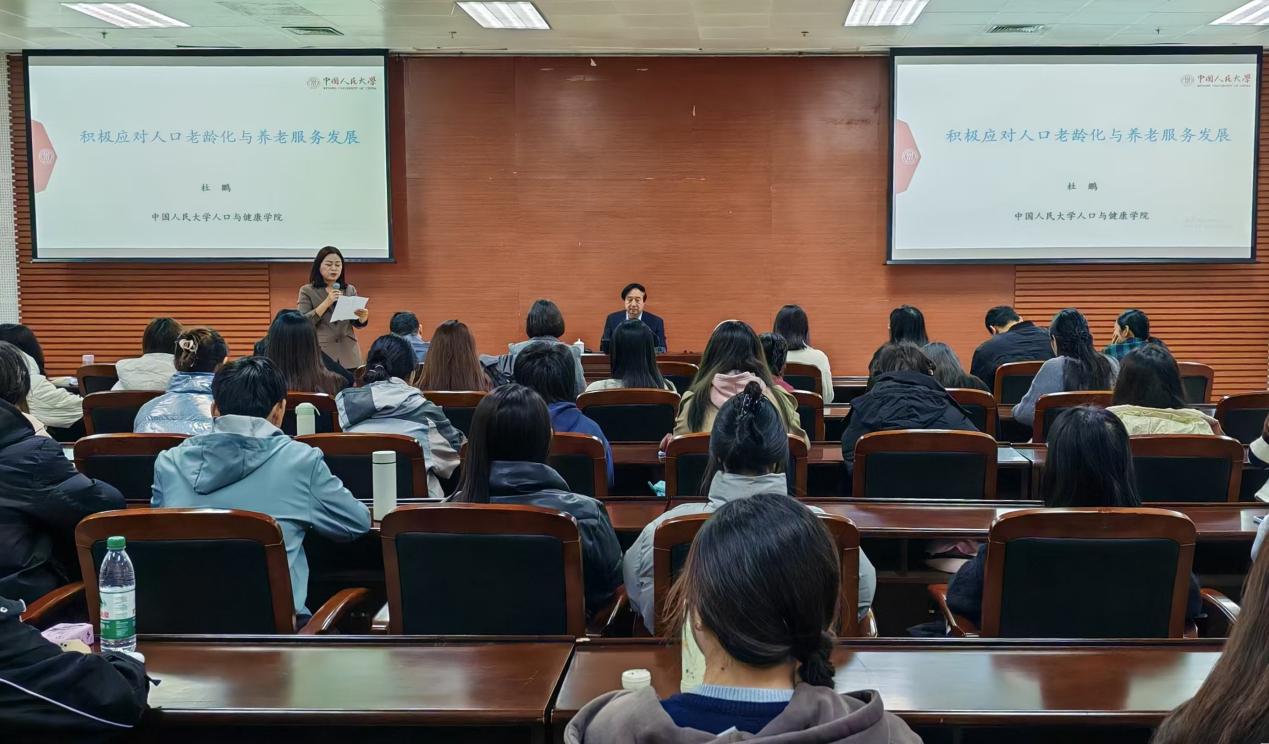 杜鵬作了題為《積極應對人口老齡化與養老服務發展》的學術報告。他深入分析了中國老齡社會新階段的特征與面臨的挑戰,就積極應對人口老齡化等問題提出了富有建設性的觀點。報告結束后,他與同學們就少數民族地區老齡化、互助養老、老齡文化建設等內容展開了積極交流,現場氣氛熱烈。