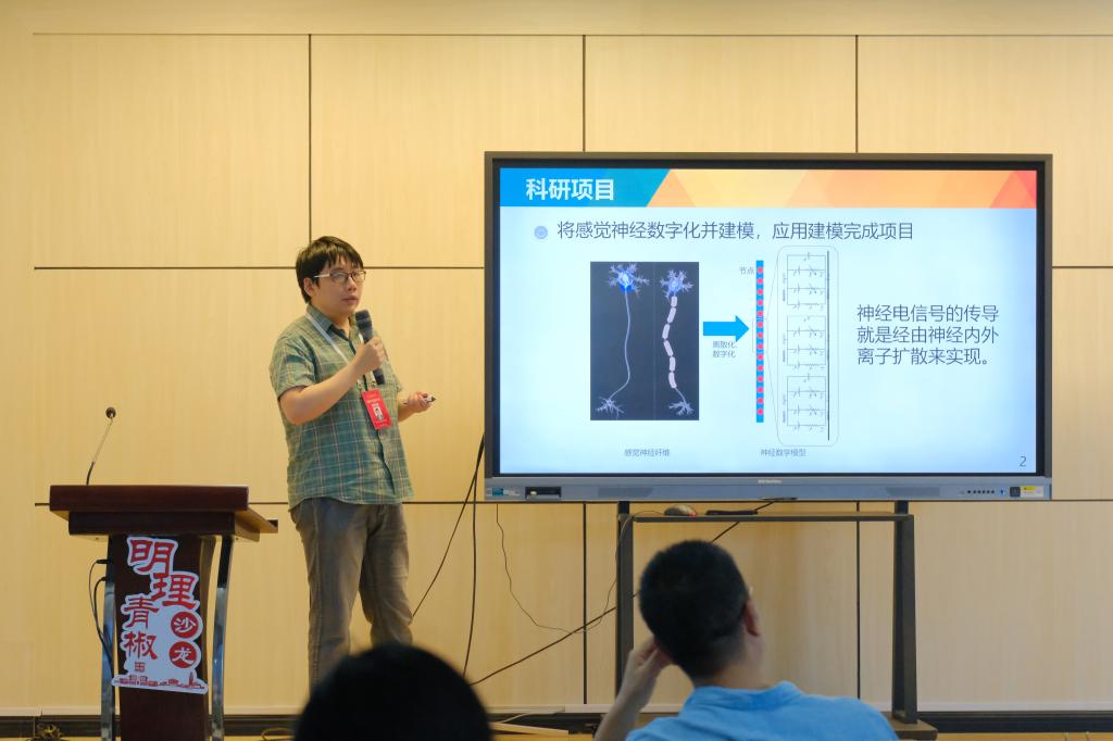 何思彧圍繞“神經傳導的數學表達及神經選擇性刺激研究”,介紹了利用數學建模形式研究選擇性刺激神經問題,重點對神經模型、刺激傳導模型以及解決的問題進行了說明。他還提出了今后的科研方向,一是繼續深入研究人體電生理仿真、神經模型等問題;二是擴展神經數字化模型在不同領域上的應用,并與其他領域進行交叉融合;三是尋找更加契合學科發展目標的新研究方向。