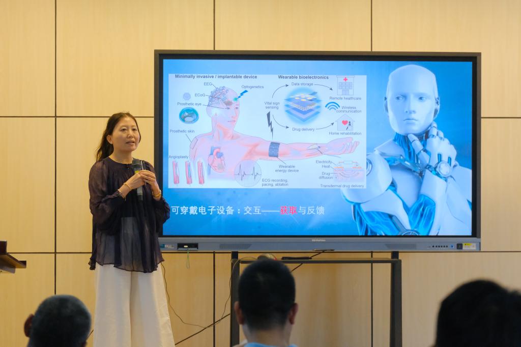 秦文靜作了“基于三維導電網絡的柔性可穿戴傳感材料與器件”的報告。她表示,根據應用場景可以提供不同的電極與傳感材料,豐富的結構、材料組合可提供多傳感特性和多功能性,具有高靈敏度和穩定性、良好的皮膚共形能力和生物相容性、工藝簡單等優勢。她希望能夠在多模態傳感器、電路設計、軟件開發、大數據分析等方面尋求更多合作。