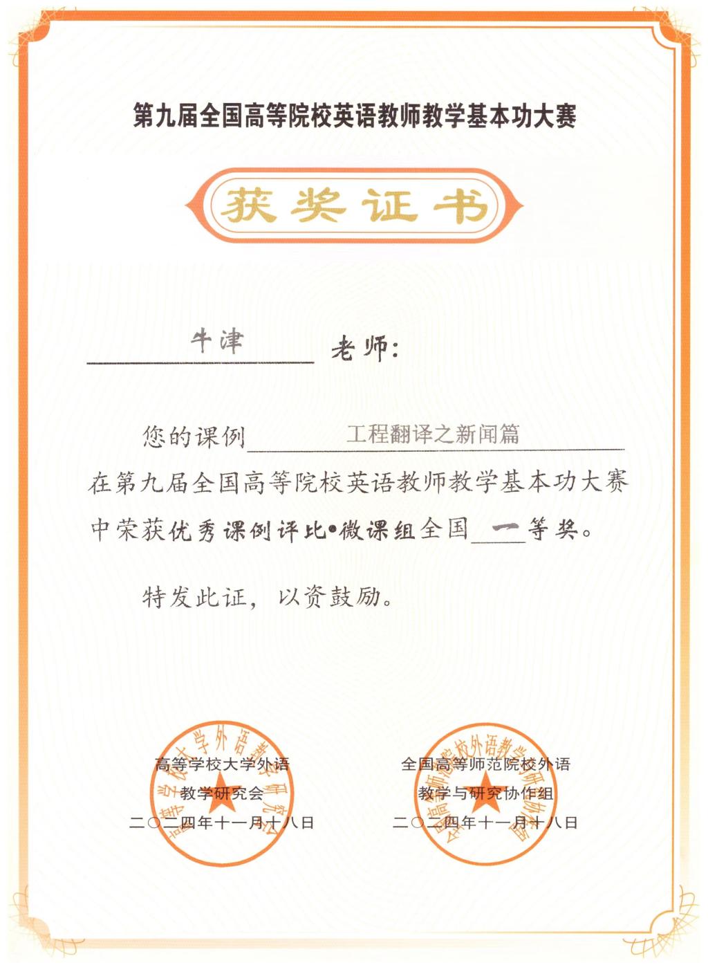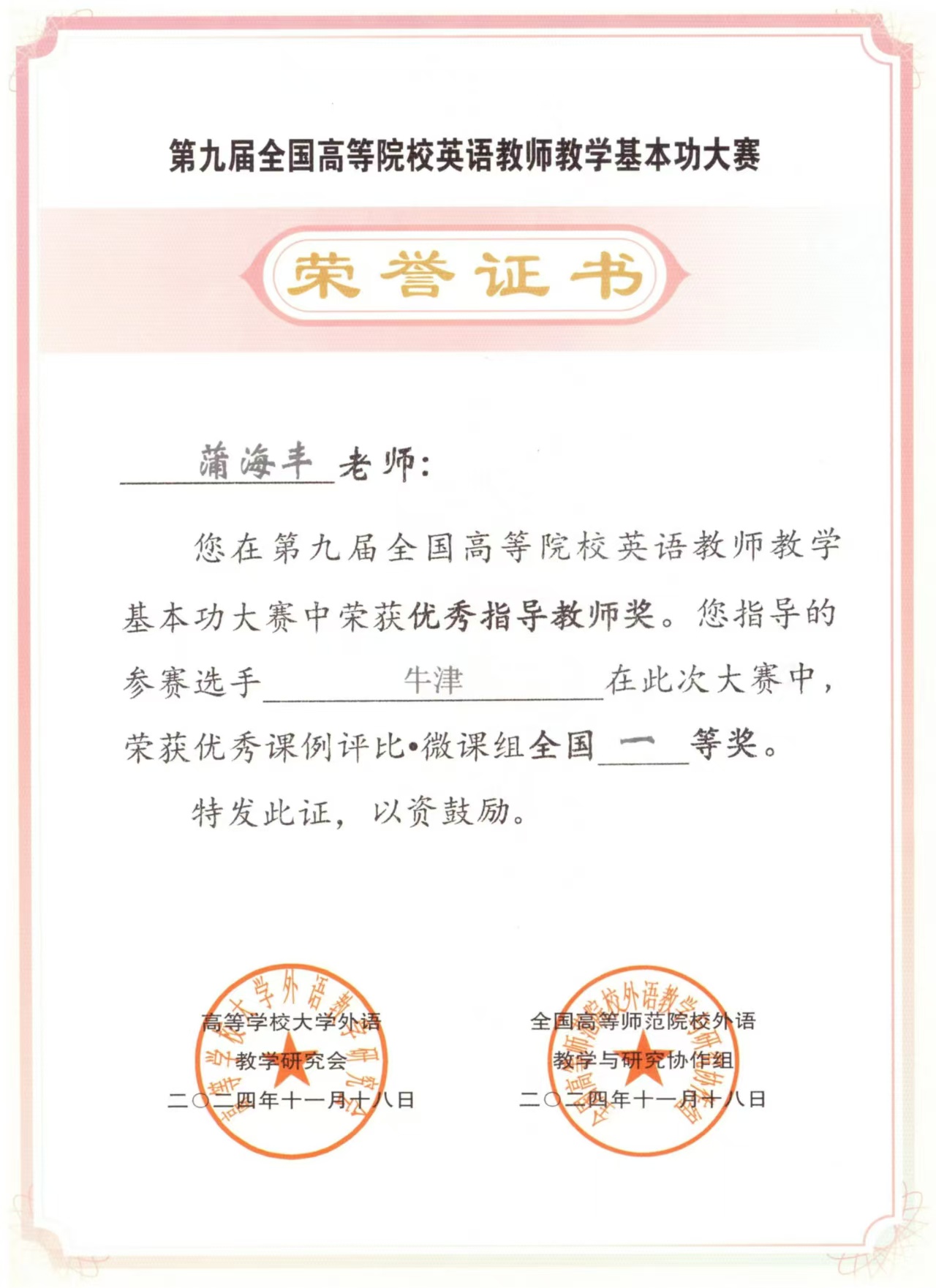 2024年全國高等院校英語教學學術(shù)年會暨第九屆全國高等院校英語教師教學基本功大賽在湖北省武漢市舉辦。我校語言文化學院英語系教師牛津榮獲優(yōu)秀課例評比?微課組全國一等獎,蒲海豐榮獲優(yōu)秀指導教師獎。