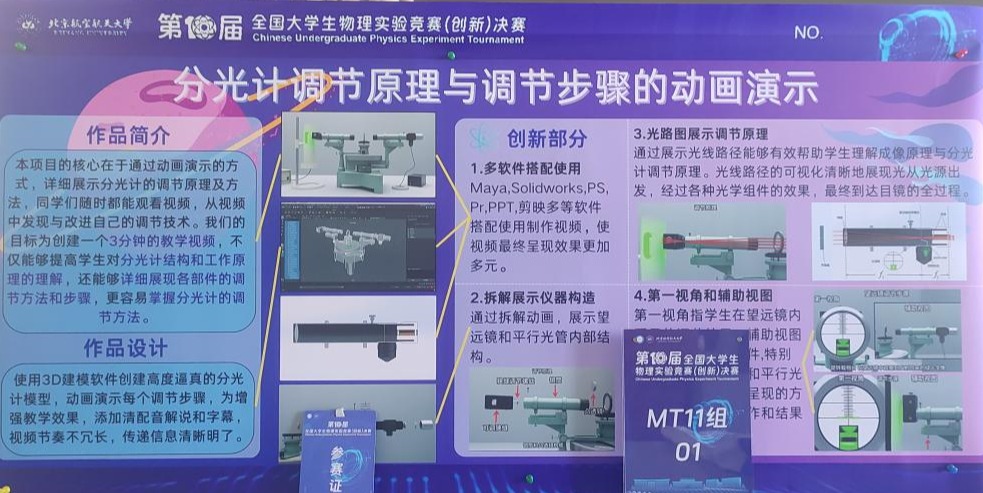 自賽事開展以來,我校充分發(fā)揮學(xué)科優(yōu)勢(shì),積極組織學(xué)生報(bào)名參賽,進(jìn)行相關(guān)培訓(xùn)。參賽學(xué)生涵蓋理學(xué)院、集成電路科學(xué)與工程學(xué)院、材料科學(xué)與工程學(xué)院等多個(gè)學(xué)院。經(jīng)過校賽、市賽復(fù)賽及網(wǎng)絡(luò)評(píng)審等環(huán)節(jié),8支參賽隊(duì)伍參加市賽,并榮獲市級(jí)一等獎(jiǎng)1項(xiàng)、市級(jí)二等獎(jiǎng)4項(xiàng)、市級(jí)三等獎(jiǎng)3項(xiàng)。最終,學(xué)校4支隊(duì)伍被推薦參加全國(guó)總決賽。經(jīng)過參賽師生的悉心準(zhǔn)備和精彩現(xiàn)場(chǎng)展示,由物理實(shí)驗(yàn)中心教師李曉蘭指導(dǎo),學(xué)生趙朝源、馬福祥、陳祥瑞、張逸成參與的《分光計(jì)調(diào)節(jié)原理與調(diào)節(jié)步驟的動(dòng)畫演示》作品獲自選命題類全國(guó)決賽一等獎(jiǎng);由物理實(shí)驗(yàn)中心教師于丹指導(dǎo),學(xué)生馮杰、賈云博、廖海瑯參與的《空氣中聲速的測(cè)定》作品獲講課類全國(guó)二等獎(jiǎng)。