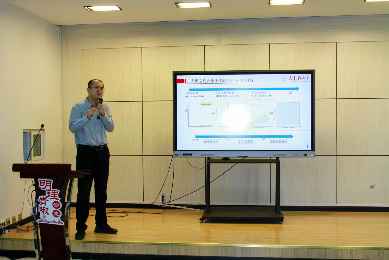 陳建恩以“非線性振動能量傳遞特征與控制研究”為題,介紹了強非線性吸振器、聲振非互易性和機械湍流三項研究中的能量傳遞調控方法、三個研究方向的相互聯系、研發歷程以及成果優勢等內容。