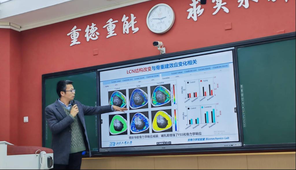 北京工業大學楊海勝教授作題為《力調控骨重建生物力學機理的微觀解析》的學術報告。他回顧了骨功能適應性理論研究歷史,詳細闡述了團隊在闡明骨重建中微觀陷窩——小管網絡流體剪應力重要作用的研究進展,研究結果表明骨細胞網絡改變會影響流體動力學的微環境,進而影響骨的重建,這與骨質疏松相關。