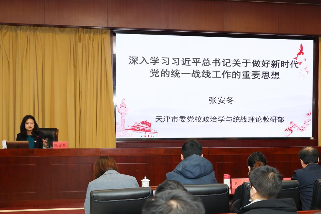此次培訓(xùn)班邀請市委黨校政治學(xué)與統(tǒng)戰(zhàn)理論教研部副教授張安冬以《學(xué)習(xí)貫徹習(xí)近平總書記關(guān)于做好新時(shí)代黨的統(tǒng)一戰(zhàn)線工作的重要思想》為題開展講座。她圍繞準(zhǔn)確把握新時(shí)代愛國統(tǒng)一戰(zhàn)線的歷史方位、深刻領(lǐng)會(huì)習(xí)近平總書記關(guān)于做好新時(shí)代黨的統(tǒng)一戰(zhàn)線工作的重要思想核心要義及圍繞中心服務(wù)大局畫出最大同心圓三個(gè)方面,細(xì)致解讀了習(xí)近平總書記關(guān)于做好新時(shí)代黨的統(tǒng)一戰(zhàn)線工作的重要思想,進(jìn)一步強(qiáng)化學(xué)員們在新時(shí)代新征程中凝心聚力,奮力譜寫統(tǒng)一戰(zhàn)線事業(yè)新篇章的責(zé)任與使命。