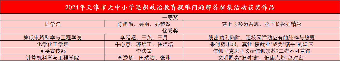 近日,市教育兩委公布了思想政治類系列比賽評審結果,我校師生在“2024年天津市大中小學‘我和我求學的城市’主題教育系列活動”“2024年天津市大中小學思想政治教育疑難問題解答征集活動”等多項比賽中斬獲佳績。