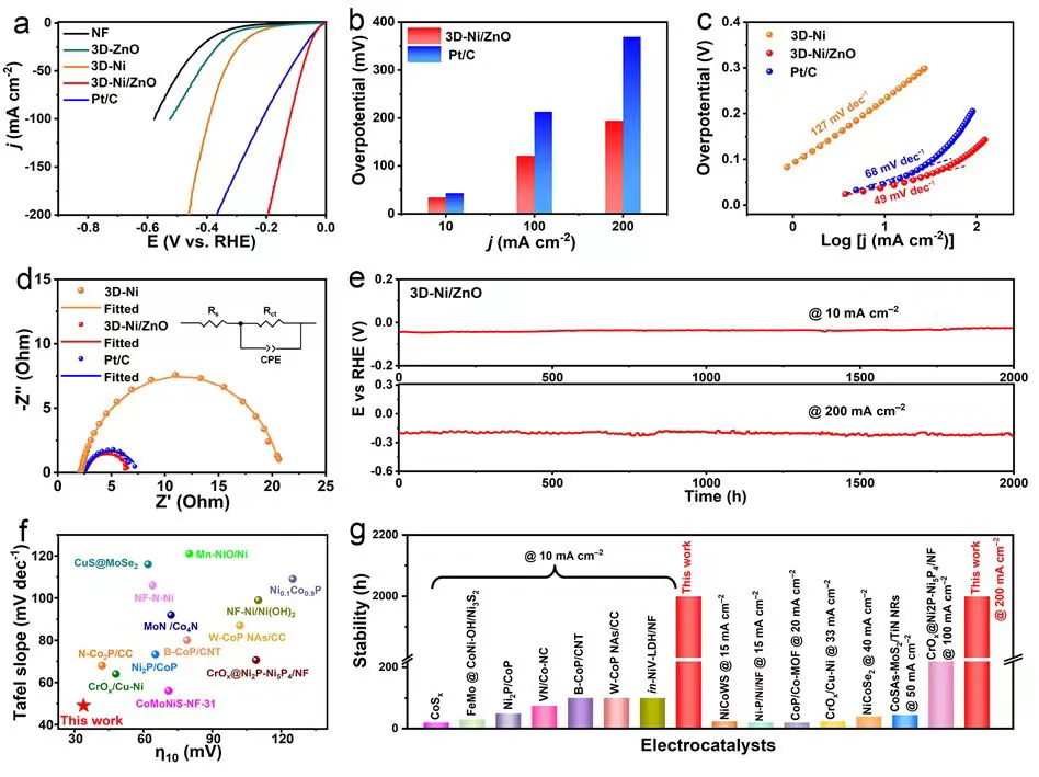HER性能測試表明,3D-Ni/ZnO表現出優異的HER活性,僅需34、121和194 mV的過電位即可分別獲得10、100和200mA cm-2的電流密度,性能顯著優于Pt/C催化劑。Tafel斜率分析顯示,相對于Ni催化劑,3D-Ni/ZnO的HER機制從Volmer控制步驟轉變為效率更高的Volmer-Heyrovsky機制。此外,3D-Ni/ZnO能夠在10和200mA cm-2的電流密度下穩定運行超過2000小時,展現出優異的耐久性。綜合來看,本文發展的3D-Ni/ZnO催化劑在活性和穩定性上優于大多數文獻報道的中性HER催化劑。
