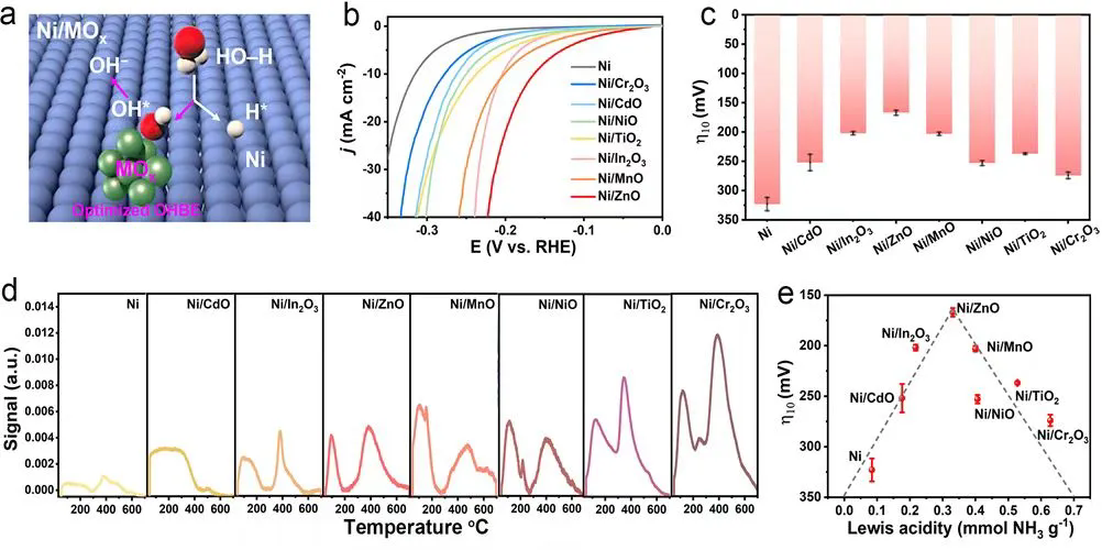 本研究利用通用的方法合成一系列Ni/MOx?異質結構催化劑,并系統研究其在中性電解液中的HER活性。進一步通過氨氣程序升溫脫附(NH3-TPD)測定催化劑的路易斯酸度,發現Ni/MOx催化劑的路易斯酸度與其HER活性呈現火山型關系。位于火山圖頂點的Ni/ZnO,由于具有適中的*OH結合能力,能夠有效平衡水分裂和*OH脫附過程,從而表現出最佳的HER活性。這一發現表明,路易斯酸度可作為一種有效的中性HER活性描述符號,其遵循Sabatier原則,即催化劑與吸附物之間的相互作用既不能太強也不能太弱。
