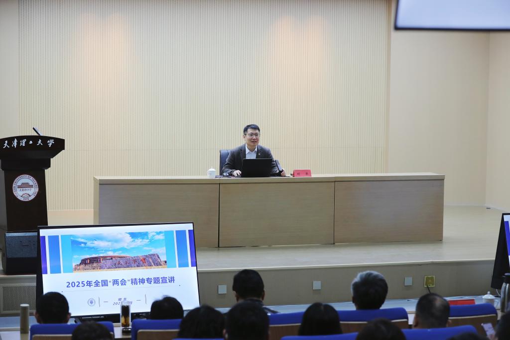 3月26日上午,學校在理學院報告廳舉辦全國兩會精神宣講報告會,邀請全國政協委員、天津大學副校長明東作專題宣講報告。校黨委副書記、校長練繼建出席報告會。校院兩級黨委理論學習中心組成員、全體處級干部、機關各黨支部黨員代表參加會議。報告會由校黨委副書記許瑞主持。