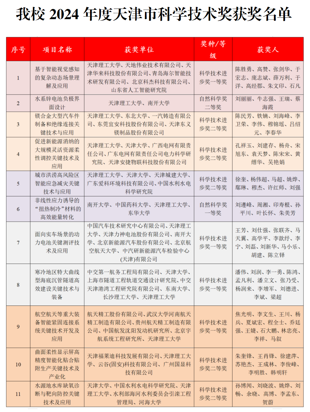 近日,2024年度天津市科學技術獎評選結果揭曉,我校主持或參與完成的11項科技成果獲得天津市科學技術獎勵。其中,作為第一完成單位獲得一等獎1項、二等獎4項;作為參與完成單位獲得一等獎4項、二等獎2項。