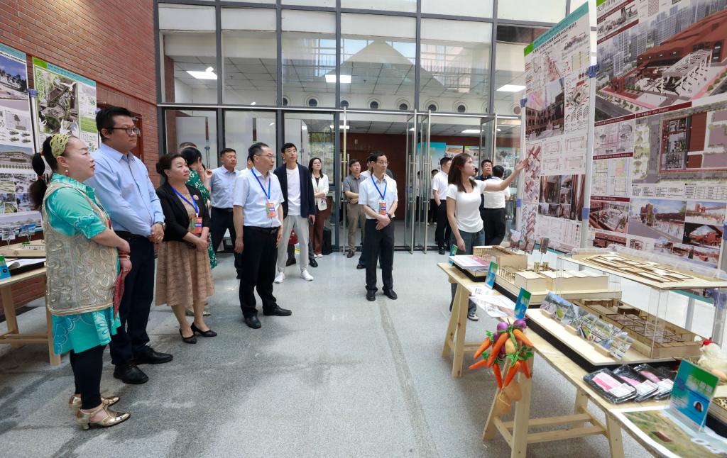 開幕式后,校領導練繼建、許瑞、陳勝勇、葉寧、王鐵、馮驊、蘇榮華,以及出席開幕式的嘉賓們參觀了畢業設計展。畢業生們站在各自展位前講解自己的設計思路與成果作品,師生們展開親切交流。各位老師為學生作品提出許多寶貴的建議,對學院師生的成果表示高度肯定。