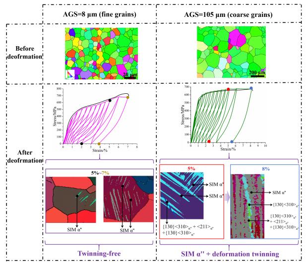通過(guò)晶粒細(xì)化策略可有效提高亞穩(wěn)β鈦合金超彈性能,這一觀點(diǎn)在學(xué)術(shù)界已得到普遍共識(shí),但一直尚未澄清晶粒尺寸對(duì)超彈合金變形機(jī)制的影響規(guī)律。高敬鈞以自主研發(fā)的Ti-20Zr-12Nb-2Sn (at.%)合金為模板,利用電子背散射衍射儀、透射電鏡、同步輻射等材料表征技術(shù)首次證實(shí)晶粒細(xì)化能有效抑制變形孿晶的激活,從而獲得最大馬氏體相變應(yīng)變。