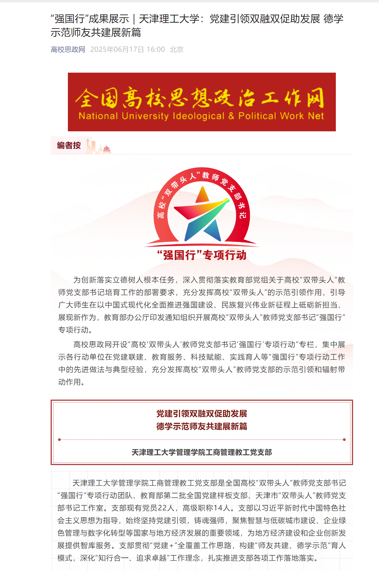 天津理工大學管理學院工商管理教工黨支部是全國高校“雙帶頭人”教師黨支部書記“強國行”專項行動團隊、教育部第二批全國黨建樣板支部、天津市“雙帶頭人”教師黨支部書記工作室。支部現有黨員22人,高級職稱14人。支部以習近平新時代中國特色社會主義思想為指導,始終堅持黨建引領,鑄魂強師,聚焦智慧與低碳城市建設、企業綠色管理與數字化轉型等國家與地方經濟發展的重要領域,為地方經濟建設和企業創新發展提供智庫服務。支部貫徹“黨建+”全覆蓋工作思路,構建“師友共建、德學示范”育人模式,深化“知行合一、追求卓越”工作理念,扎實推進支部各項工作落地落實。