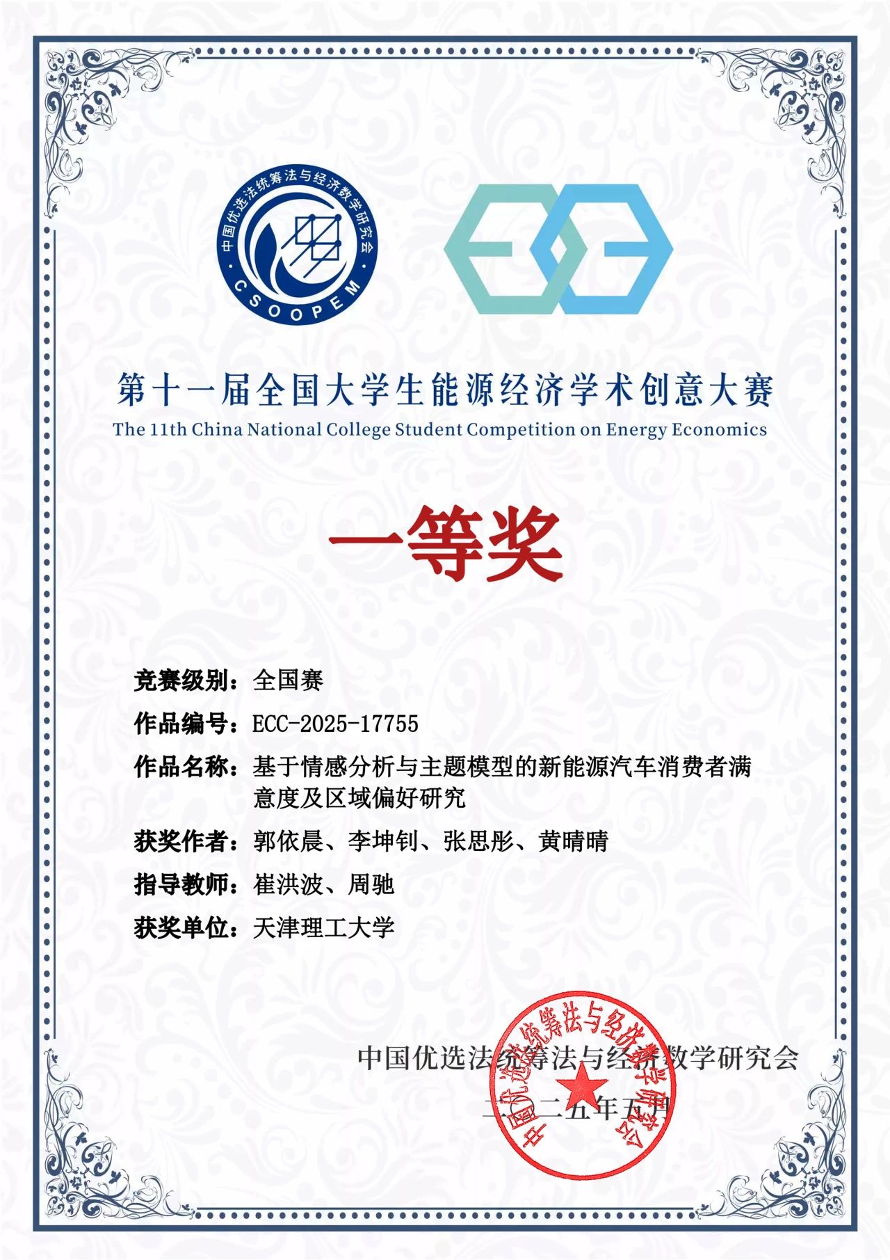 第十一屆全國大學(xué)生能源經(jīng)濟學(xué)術(shù)創(chuàng)意大賽總決賽于5月24日至25日在山西財經(jīng)大學(xué)舉辦。經(jīng)過激烈角逐,我校管理學(xué)院本科生郭依晨、李坤釗、張思彤、黃晴晴共同完成的作品《基于情感分析與主題模型的新能源汽車消費者滿意度及區(qū)域偏好研究》榮獲本科生組全國一等獎,這是我校首次榮獲該獎項。學(xué)校管理學(xué)院教師崔洪波和周馳榮獲優(yōu)秀指導(dǎo)教師。