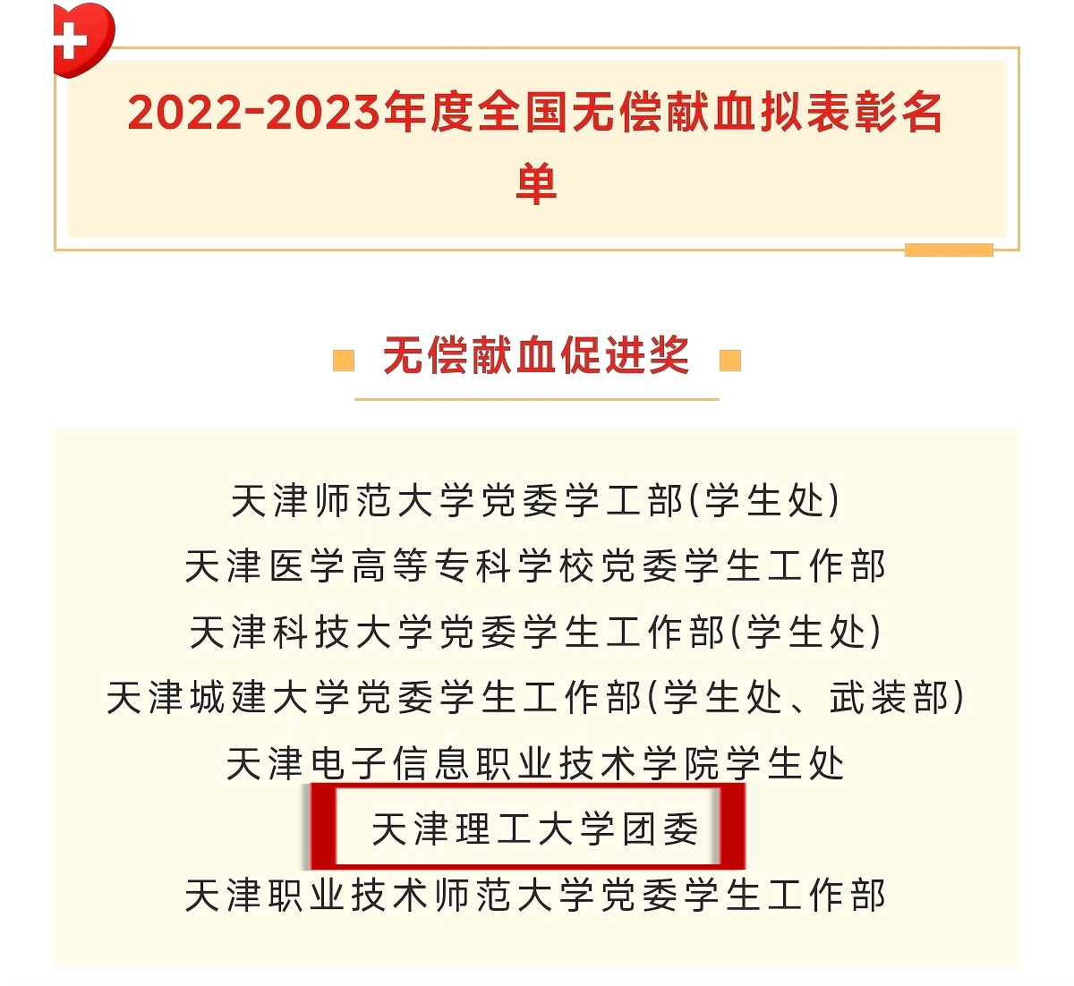 近日,國家衛(wèi)生健康委、中國紅十字會總會、中央軍委后勤保障部衛(wèi)生局聯(lián)合發(fā)布《關(guān)于表彰2022—2023年度全國無償獻(xiàn)血表彰獎勵獲獎?wù)叩臎Q定》,我校榮獲2022—2023年度“全國無償獻(xiàn)血促進(jìn)獎單位獎”。這一國家級榮譽的獲得,是對我校長期以來踐行社會責(zé)任、弘揚人道主義精神的高度肯定,更是全體天理師生無私奉獻(xiàn)的生動體現(xiàn),我校已連續(xù)6次獲此殊榮。