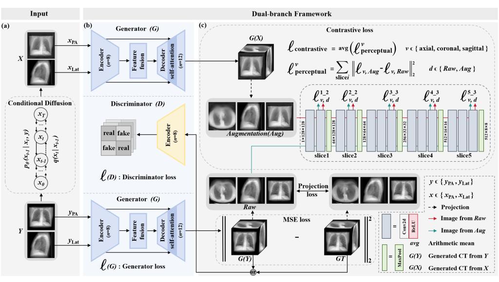 該研究聚焦于從X射線圖像到CT圖像的重建,針對因輸入信息維度受限和輸入樣本不足而導致結構與紋理重建困難的問題,提出了一種基于條件擴散模型與對比學習的重建方案。該方案利用條件擴散模型對X射線圖像進行骨骼抑制用于數據增強,有效緩解了二維輸入信息不足的問題。同時,基于對比學習的雙端網絡聯合構建了對比損失、投影損失以及GAN的對抗性損失并在一個端到端的統一框架中進行高效學習,顯著提升了重建CT的結構和紋理質量。大量實驗結果驗證了該方案的優越性,所生成CT圖像在PSNR、SSIM等關鍵指標上均達到SOTA水平,并呈現出較強的臨床應用潛力。