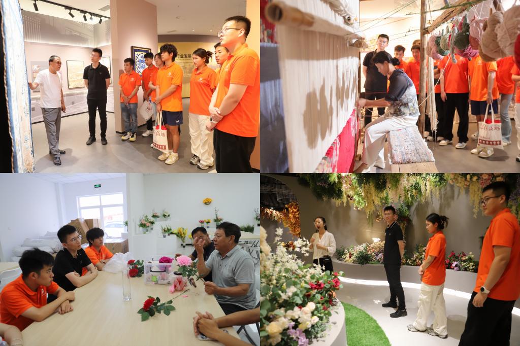 在“地毯之鄉”崔黃口鎮,實踐團走進織采宮——崔黃口地毯文化展覽館。在講解人員的介紹下,了解百年地毯產業如何成為世界地毯三大產業聚焦區之一。同學們實際觸摸各種材質地毯,近距離觀看手工織毯;探訪曹子里絹花文化園,參觀了黨建展示、歷史沿革、主題展館、精品展示、電商直播和非遺體驗六大功能區;在非遺傳承人李秀亭老師與苑澤春老師的講解下,體驗手工絹花的非遺魅力。