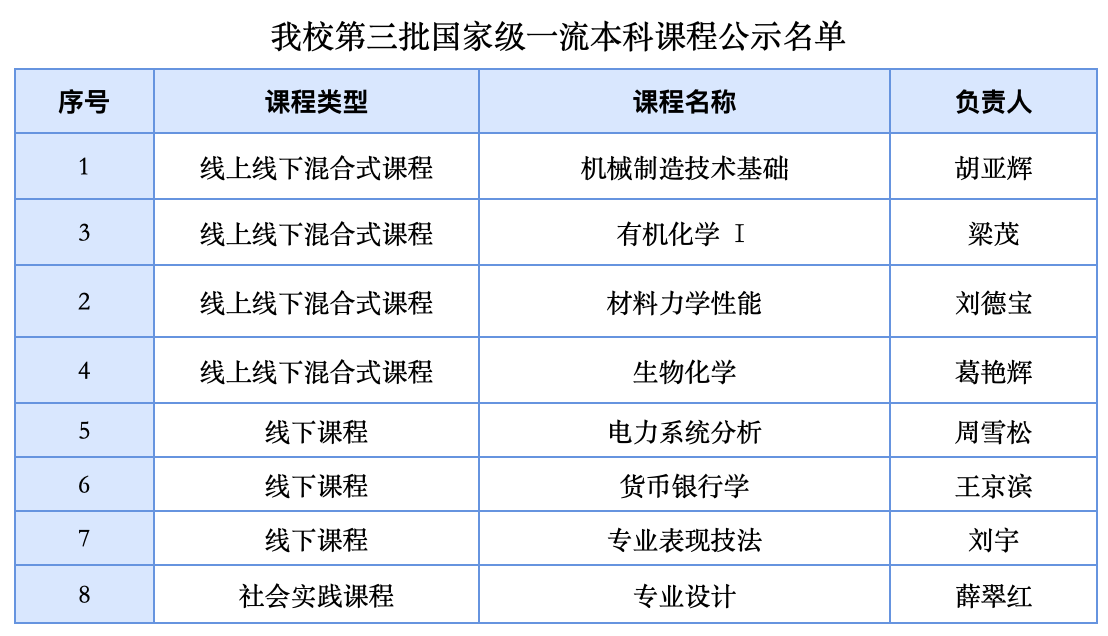 8月21日,教育部公示了第三批國家級一流本科課程認定結果,擬認定5999門課程為第三批國家級一流本科課程。我校共計8門課程入選,涵蓋線上線下混合式課程4門、線下課程3門、社會實踐課程1門。