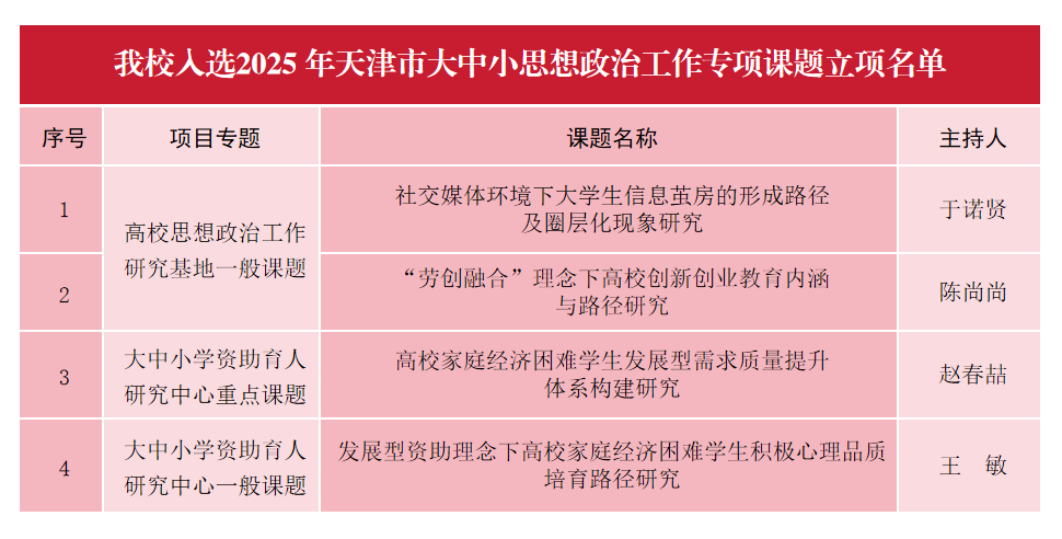 在2025年獲批立項的187項天津市大中小思想政治工作專項課題中,我校共獲批課題4項,其中重點課題1項,一般課題3項。