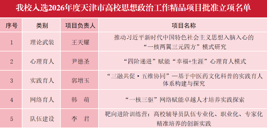 在2026年度天津市高校思想政治工作精品項目申報工作中,全市共收到立項申報226項,決定批準立項85項,我校在理論武裝、心理育人、實踐育人、網絡育人、隊伍建設類別中共有5個項目脫穎而出進入批準立項名單。