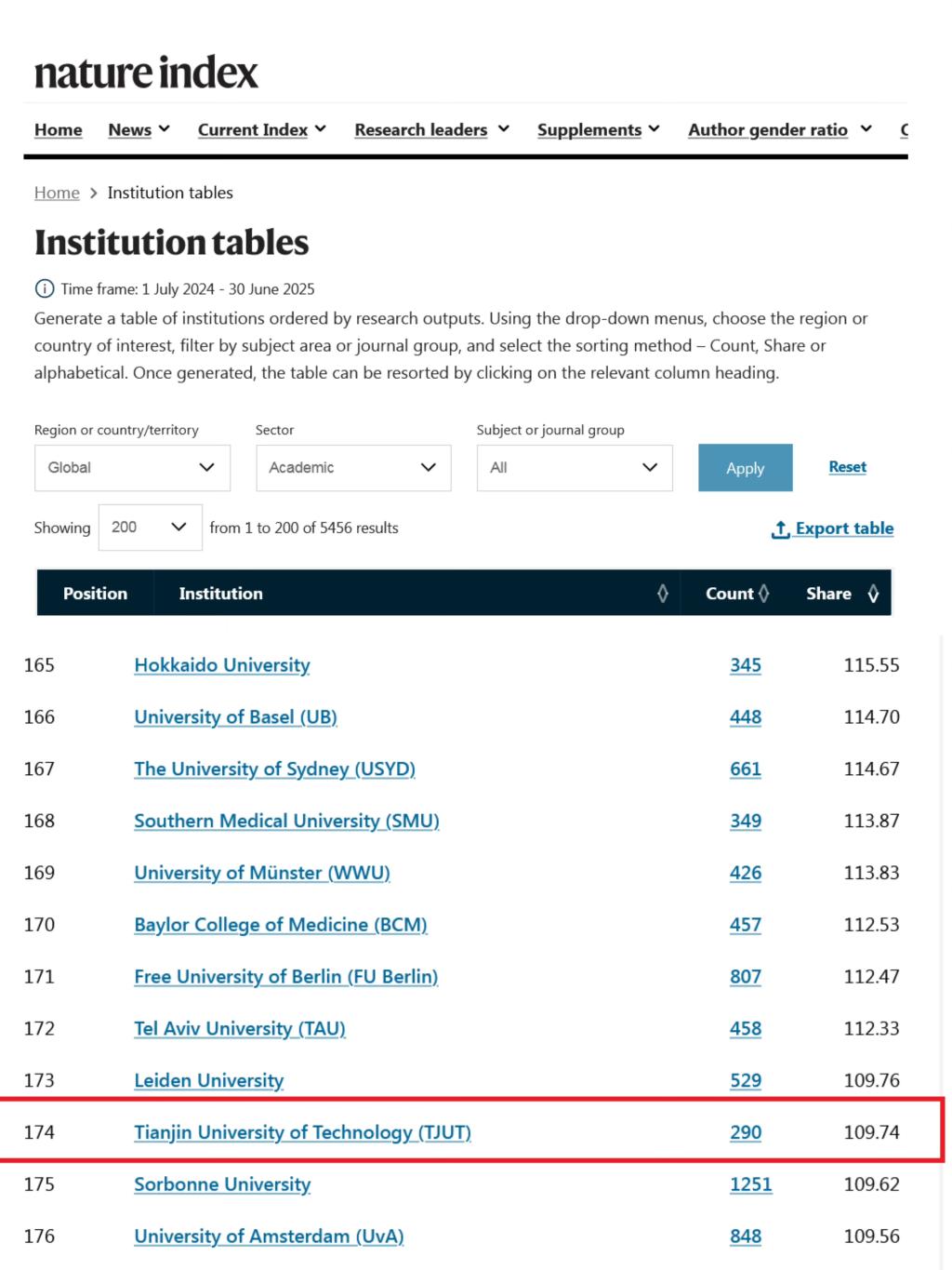 日前,自然指數官網(https://www.nature.com/nature-index/)發布了最新一期自然指數排名(數據統計范圍2024年7月1日至2025年6月30日),我校整體自然指數排名進一步躍升,進入全球科研機構前200行列,位列全球高校第174名。數據顯示,在中國內地高校中,我校自然科學綜合排名第68位,相比2024年提升19個名次,其中化學學科表現最為突出,位列內地高校第50位。自然指數排名的穩步攀升,不僅是學??蒲腥蛴绊懥Σ粩嘣鰪姷闹庇^體現,更清晰反映出近年來學校學科建設和基礎理論研究領域取得的顯著進步與豐碩成果。