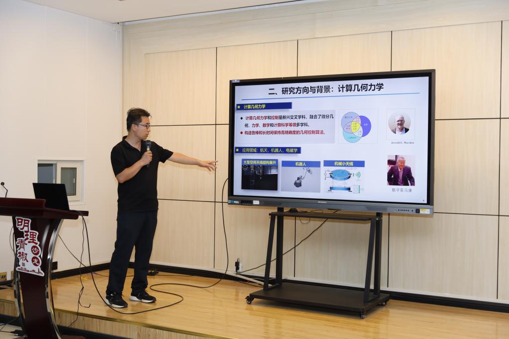 安志朋作“微分幾何在機器人和航天動力學中的一些應用”報告。他針對機器人、空間飛網等系統,通過活動標架法與幾何力學探索其幾何結構,建立了可精確重構的簡化動力學模型,同時,基于離散變分原理提出了保結構算法,為相關系統的建模、仿真與控制提供了高效解決方案。