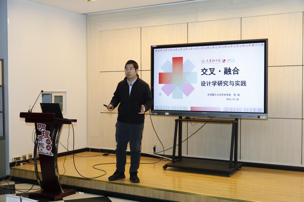 張旭聚焦“設(shè)計+文旅”“設(shè)計+地方產(chǎn)業(yè)”“設(shè)計+智能制造”“設(shè)計+科學(xué)研究”“設(shè)計+AI”五個融合方向,作題為“交叉融合——設(shè)計學(xué)研究與實踐”的學(xué)術(shù)報告。他通過非遺傳統(tǒng)手工藝產(chǎn)業(yè)化再設(shè)計、AI賦能文旅宣傳、高端裝備研發(fā)設(shè)計等具體案例,深入剖析了設(shè)計學(xué)跨學(xué)科應(yīng)用的創(chuàng)新模式與實踐路徑。