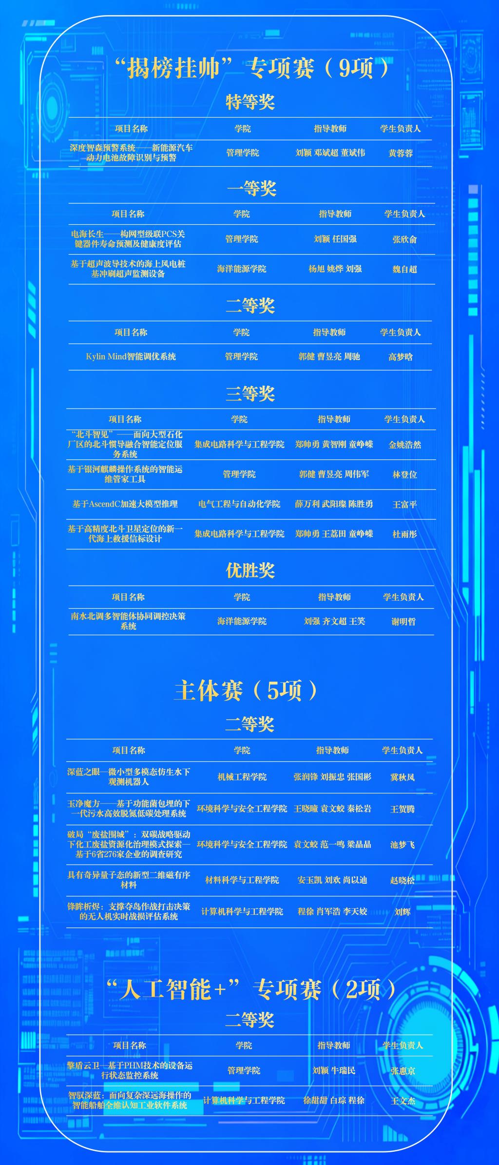 11月4日,第十九屆“挑戰杯”中國移動全國大學生課外學術科技作品競賽在南京大學圓滿落下帷幕。我校在本屆競賽中共榮獲16項國家級獎項。其中“揭榜掛帥”專項賽中特等獎1項、一等獎2項、二等獎1項、三等獎4項、優勝獎1項;主體賽二等獎5項;“人工智能+”專項賽二等獎2項。獲獎數量創歷年參賽成績新高,競賽成績位于天津市屬院校首位。