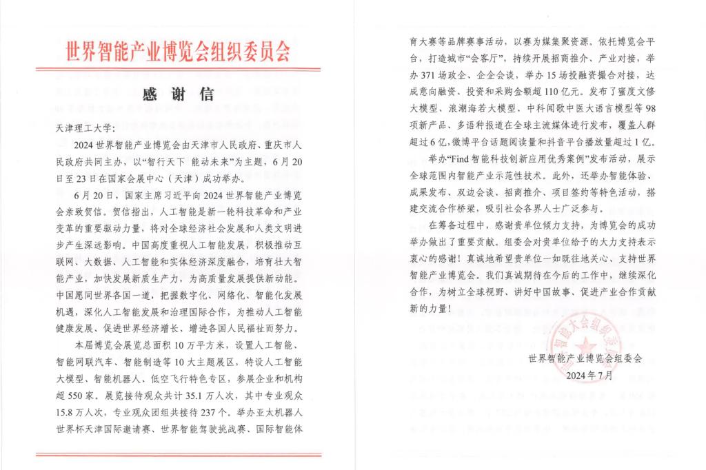近日,學校收到世界智能產業博覽會組委會的感謝信,信中對我校在博覽會舉辦過程中所給予的支持表示感謝。