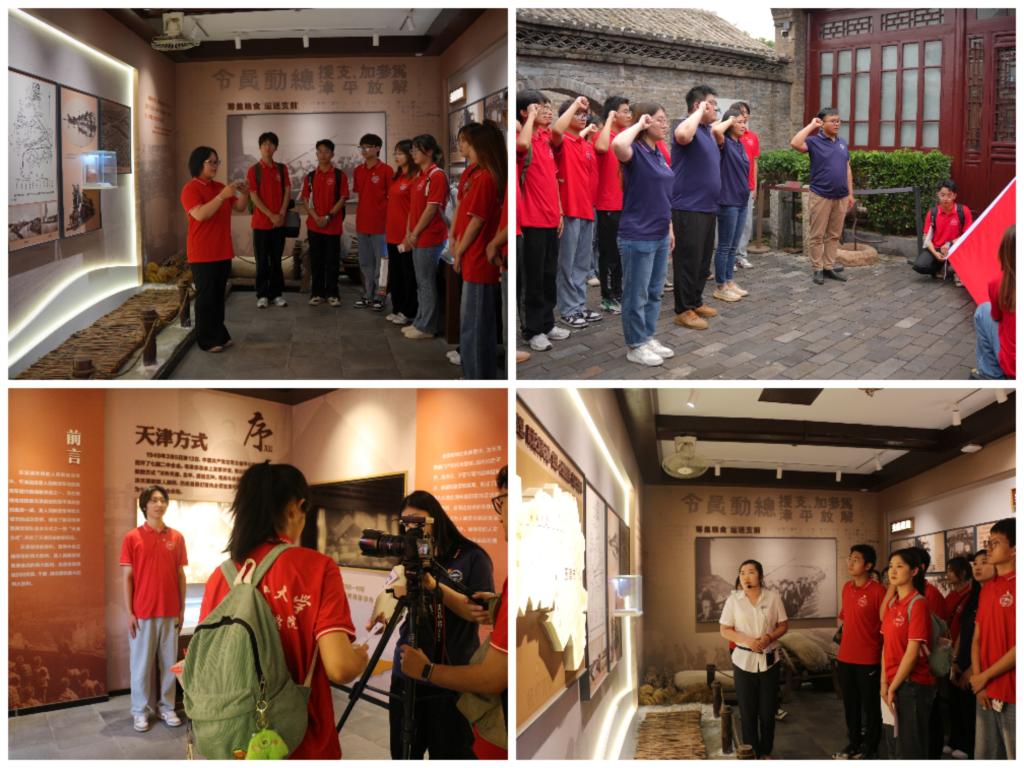 在平津戰役天津前線指揮部舊址,實踐團通過參觀學習、沉浸體驗、主題宣講等方式傳承紅色基因,賡續紅色血脈。大家跟隨講解員的腳步,回顧革命先烈艱苦卓絕、英勇奮斗的歷程;在小院內,師生重溫入團誓詞,進一步堅定理想信念;錄制“平津戰火榮光,青春使命擔當”“尋跡紅色遺址,感悟百年初心”主題微課;開展“團旗下的演講”,沉浸式自講、自學、自悟,與革命先烈跨時空“對話”。