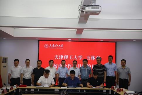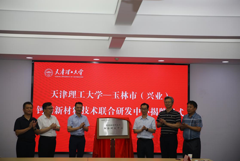 材料科學與工程學院李文江教授與廣西興業時泰納米科技有限公司總經理何雨時、興業宏光納米科技有限公司總經理吳效杰,就技術成果轉化合作簽訂戰略合作協議;校團委主要負責同志與玉林團市委相關負責同志簽署大學生社會實踐基地共建協議。陳勝勇、王永堅等共同為“天津理工大學—玉林市(興業)鈣基新材料技術聯合研發中心”揭牌。