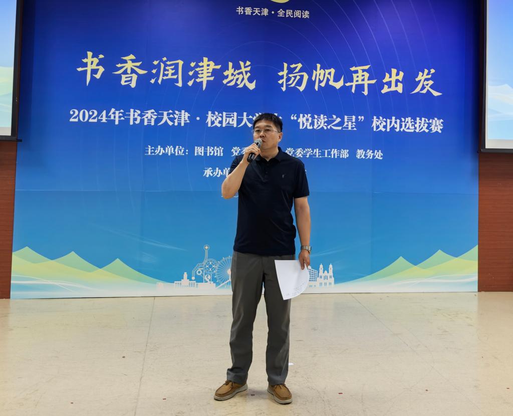 6月12日,2024年書香天津·校園大學生“悅讀之星”校內選拔賽在圖書館多功能廳舉辦。黨委常委、副校長陳勝勇出席并致辭,天津音樂廣播主任編輯、“悅讀空間”美育基地指導教師陳凌靈,“書香天津新時代閱讀推廣人”、讀者之星網絡科技有限公司總經理李碩及學校相關部門負責同志出席并擔任評委,相關學院師生代表參加。