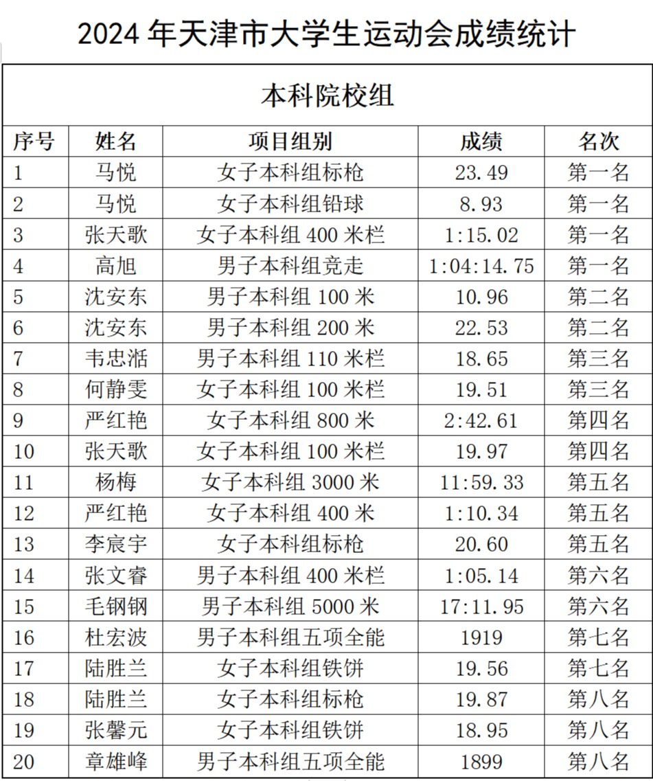 日前,天津市大學生田徑運動會在天津財經大學田徑場舉行。經過激烈比拼,學校最終取得了4個冠軍、2個亞軍和2個季軍,20人次獲得前8名。