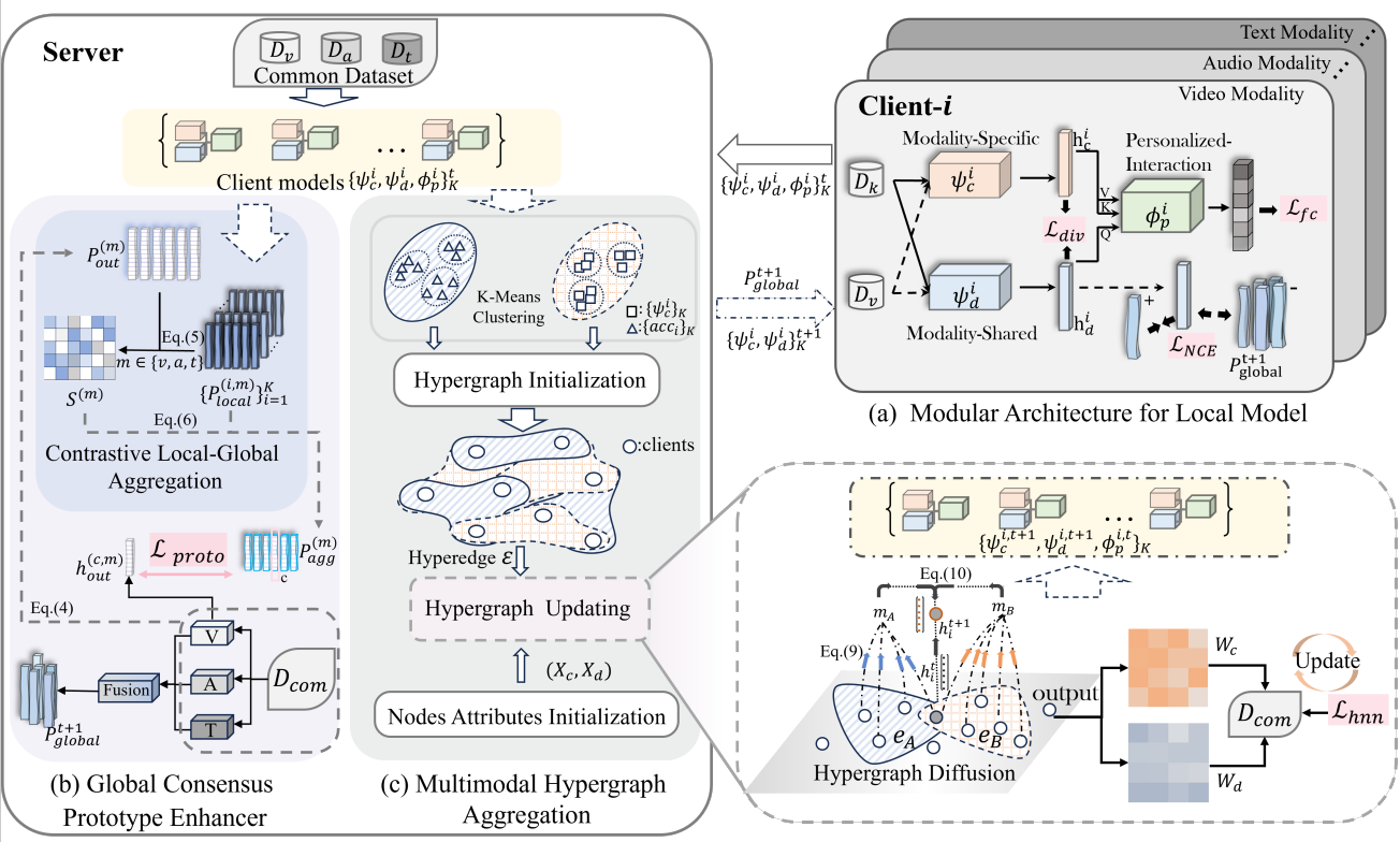 該研究針對多模態聯邦學習中常見的模態不兼容問題展開了深入研究,提出了一種創新的自適應超圖聚合的多模態聯邦學習框架。該框架通過結構化設計客戶模型、全局共識原型增強器以及自適應超圖聚合協作圖三大關鍵模塊,有效應對多模態聯邦學習環境中的模態異質性和統計異質性挑戰。即使在服務器無法獲取客戶端模態信息的情況下,該框架也能夠自適應地完成多模態客戶端聚合。