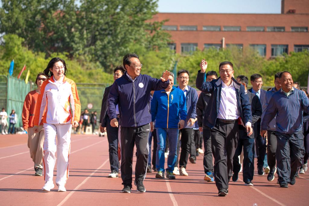 隨后,校領(lǐng)導(dǎo)走上跑道,帶領(lǐng)學(xué)生方隊(duì)與教師方隊(duì)進(jìn)行健步走。