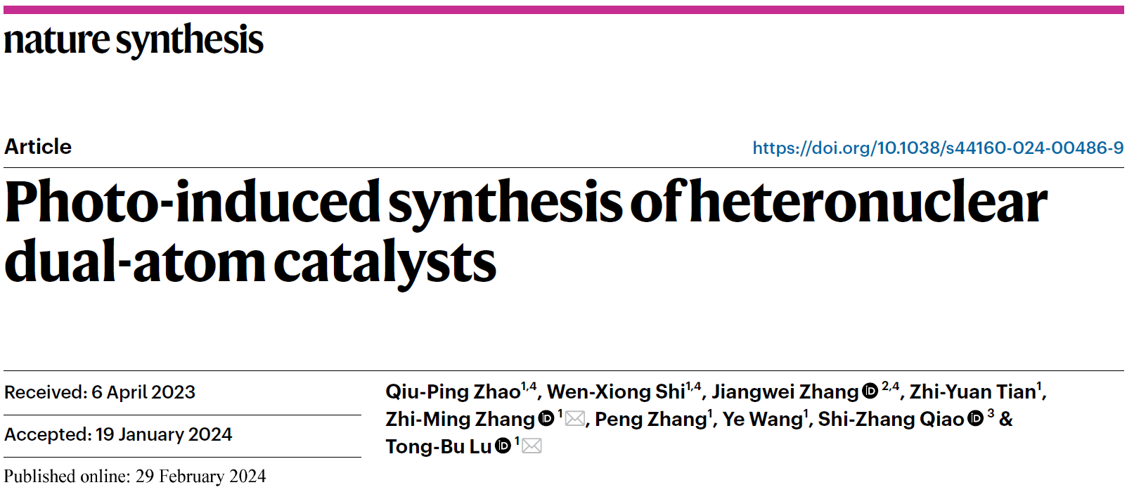 近日,我校新能源材料與低碳技術研究院張志明&魯統部教授團隊,在國際知名期刊Nature Synthesis上發表題為“Photo-induced synthesis of heteronuclear dual-atom catalysts”的論文。