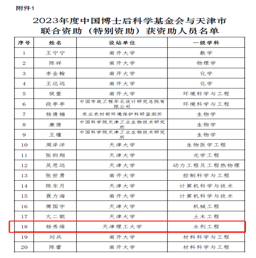 近日,中國博士后科學基金會發布了《關于公布2023年度中國博士后科學基金會與天津市聯合資助(特別資助)獲資助人員名單的通知》,我校計算機科學與技術博士后科研流動站楊秀維博士后成功入選。
