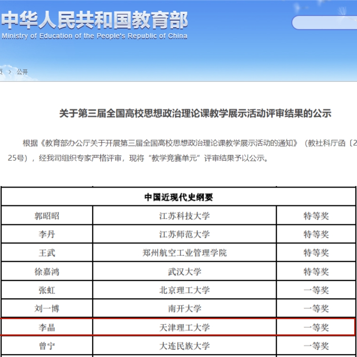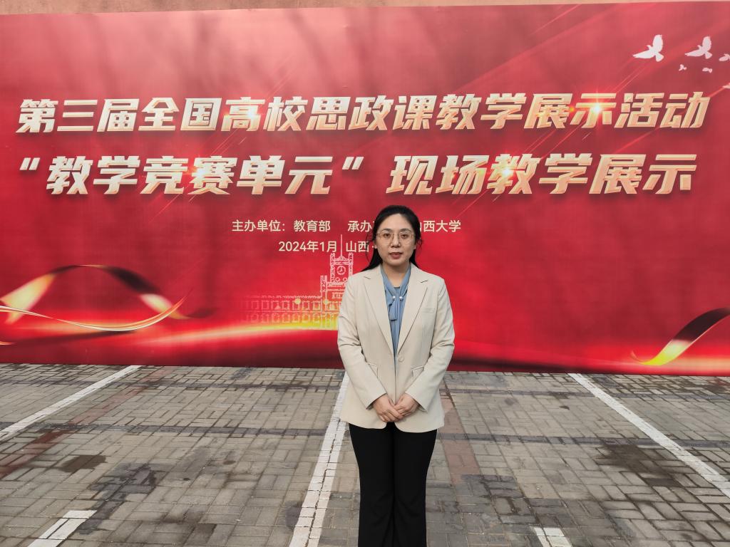 李晶作為天津市第四屆中國近現代史綱要課教學比武一等獎獲得者被推薦參加本屆比賽,她憑借扎實的教學基本功和良好的現場表現獲得所在課程組的一等獎,充分展示了我校思政課教師的風采。