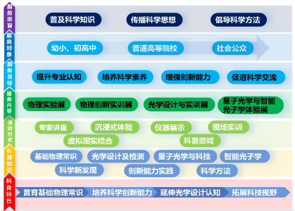 天津理工大學物理科普基地依托理學院物理實驗中心(市級物理實驗教學示范中心),建有力學、電學、光學實驗室、演示實驗室、專業物理實驗室、光電實訓平臺以及物理虛擬仿真實驗室。基地建設了“育、培、延、拓”四位一體展廳,面向大中小學、企事業單位、社區人員等,通過開展物理實驗展示、物理創新實訓、光學設計與實訓、量子光學與智能光子學體驗展等科普服務,營造場景式、體驗式、沉浸式的科普氛圍,幫助公眾了解物理學的基礎框架,培養對光學設計、量子科學等領域的認知,增加對物理學廣度和深度的理解和認識,培養科學思維和批判性思維,激發公眾的探索精神,助力全域科普向縱深發展。