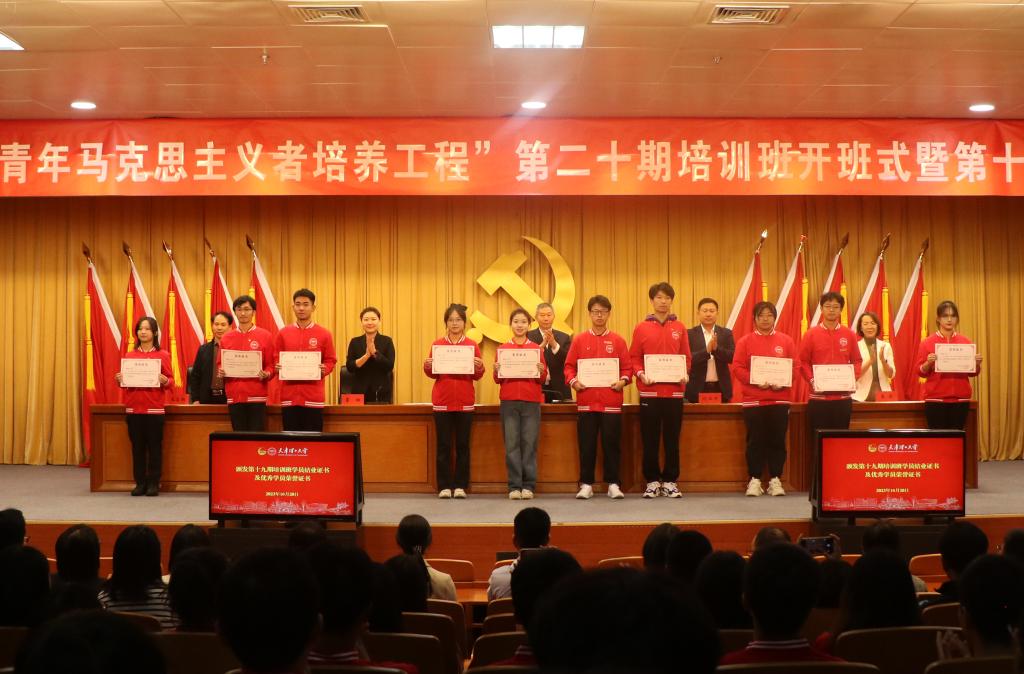 會上,校團委相關負責同志宣讀了《天津理工大學關于表彰“青年馬克思主義者培養工程”第十九期培訓班“優秀學員”的決定》。通過為期一年的理論學習、紅色教育、實踐鍛煉、專題調研和主題培訓,經過考核,共有116名學員考核合格,準予結業,并頒發了結業證書,10名學員在培訓中表現突出,被授予“優秀學員”稱號,并頒發榮譽證書。同時,為第二十期培訓班班主任頒發了聘書。