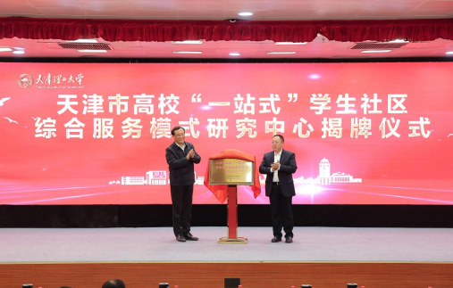 市教委副主任王秋巖和校黨委書記劉東志共同為天津市高校“一站式”學生社區綜合服務模式研究中心揭牌。