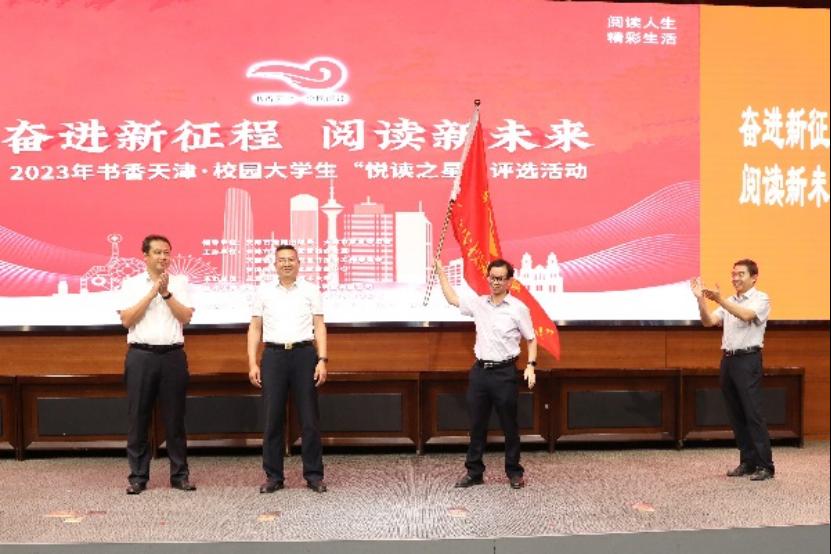 活動頒獎儀式過后,舉行了書香天津·校園大學生“悅讀之星”會旗交接儀式,黨委常委、副校長陳勝勇和圖書館負責同志接過“悅讀之星”會旗。