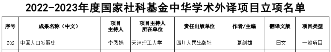近日,2022-2023年度國家社科基金中華學術外譯項目立項名單公布,全國共有234項課題獲批立項,天津市獲批7項,我校語言文化學院日語系副教授李鳳娟日譯的《中國人口發展史》項目獲批立項。