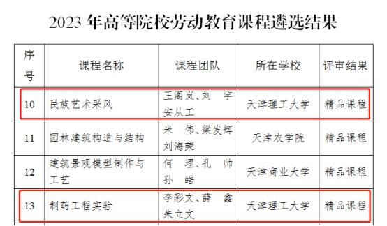 日前,天津市教委公布了2023年天津市高等院校勞動教育課程評選結果。我校藝術學院王閣嵐、劉宇、安從工課程團隊《民族藝術采風》,化學化工學院李彩文、薛鑫、朱立文課程團隊《制藥工程實驗》被評為精品課程。