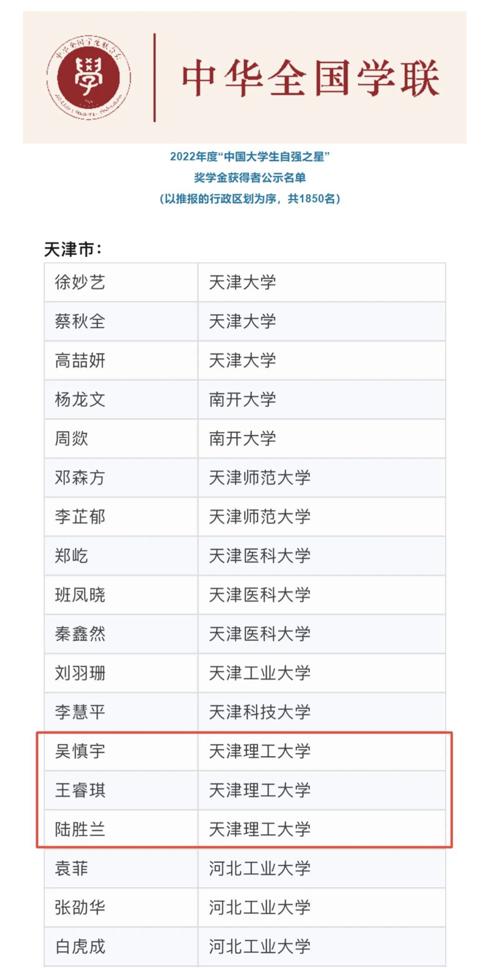 近日,由共青團中央、全國學聯指導,中國青年報社、新東方教育科技集團、中國青年創業就業基金會聯合舉辦的2022年度“中國大學生自強之星”獎學金推報活動結果揭曉,我校3名學子榮獲2022年度“中國大學生自強之星”。此次全國范圍內共表彰“中國大學生自強之星標兵”獎學金獲得者10名,“中國大學生自強之星”獎學金獲得者1850名。