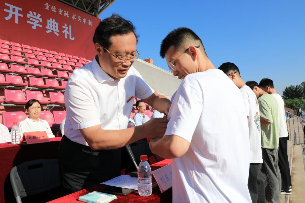 開學典禮上,校領(lǐng)導為新生代表佩戴校徽,新生們共同分享成為“天理人”的喜悅之情。