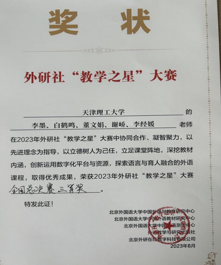 近日,2023年外研社“教學之星”大賽大學英語組全國半決賽在西安圓滿落幕。我校語言文化學院選派的大學英語教學團隊(李墨、白鶴鳴、董文娟、謝嶠、李經媛)最終以出色的表現,斬獲全國總決賽三等獎。
