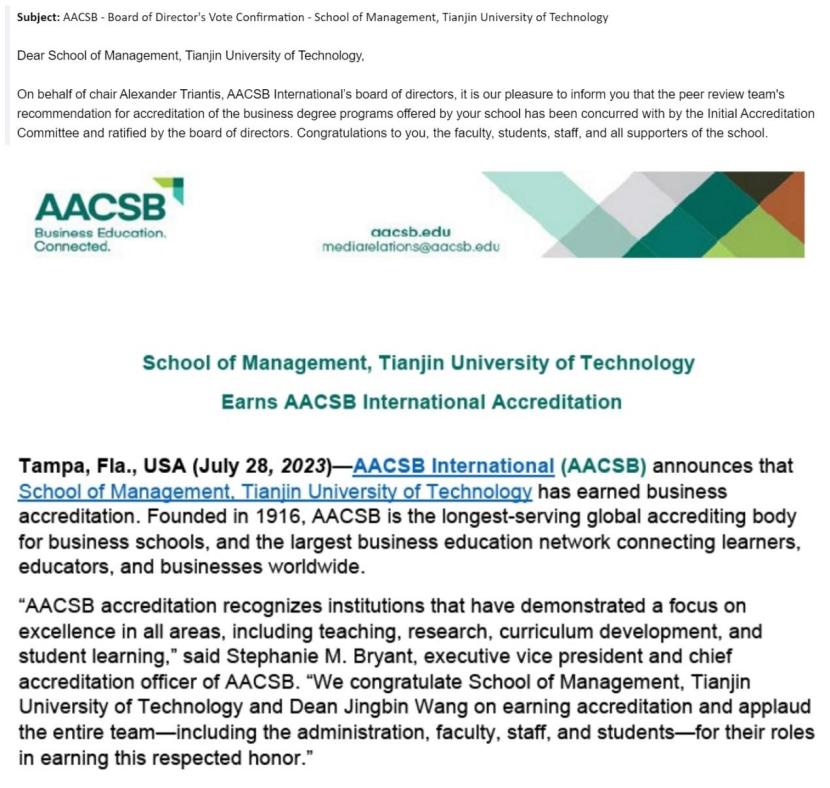 國際精英認證商學院協會執行副主席暨全球首席認證官Stephanie M. Bryant對管理學院獲得認證予以祝賀,并表示:“今天的學生是明天的商業精英。無論是在本地還是在全球,天津理工大學管理學院的加入將對AACSB教育聯盟產生持久的積極影響。”